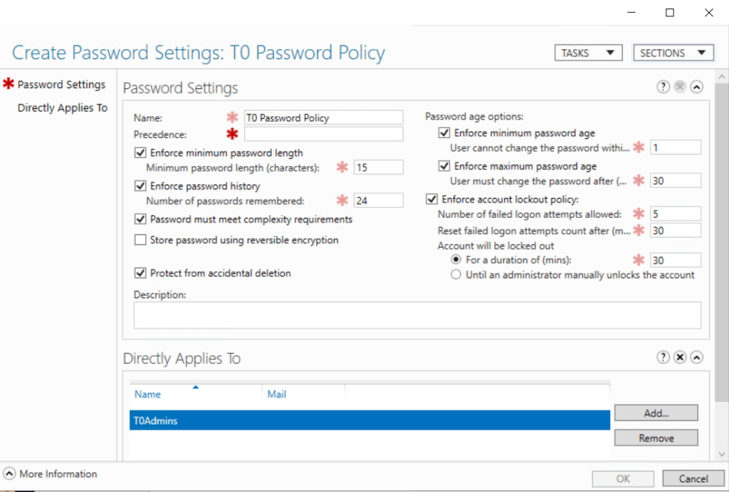 Get-ADFineGrainedPasswordPolicy -Filter {Name -like “*”} | ft Name, Precedence,MaxPasswordAge,MinPasswordLength