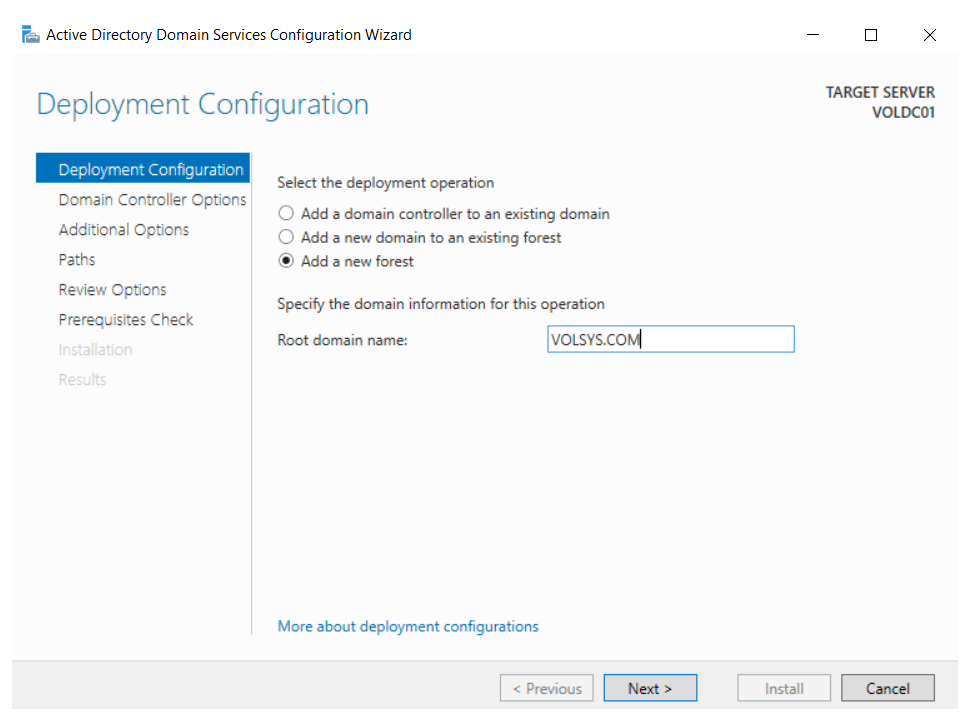 “Add a new forest” seçilerek, root domain name ismi yukarıdaki resime görüldüğü gibi verillir.