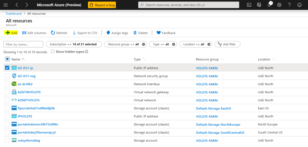 Dashboard – All resources – ADD ile yeni virtaul machine kurulumuna başlayacağız.