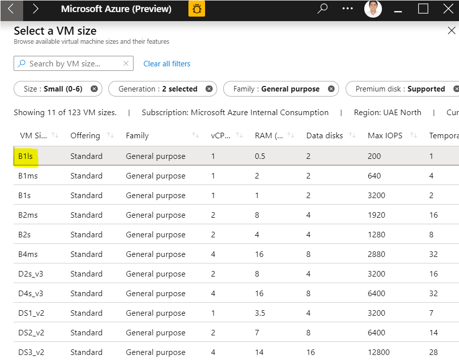 VM Size‘nı ihtiyacımıza göre aşağıdan seçiyoruz.