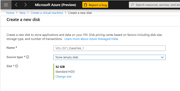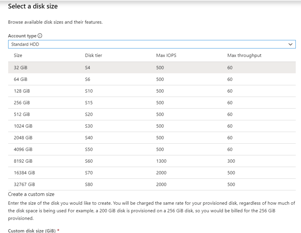 Select a disk size, Account type Standard HDD seçiyorum.