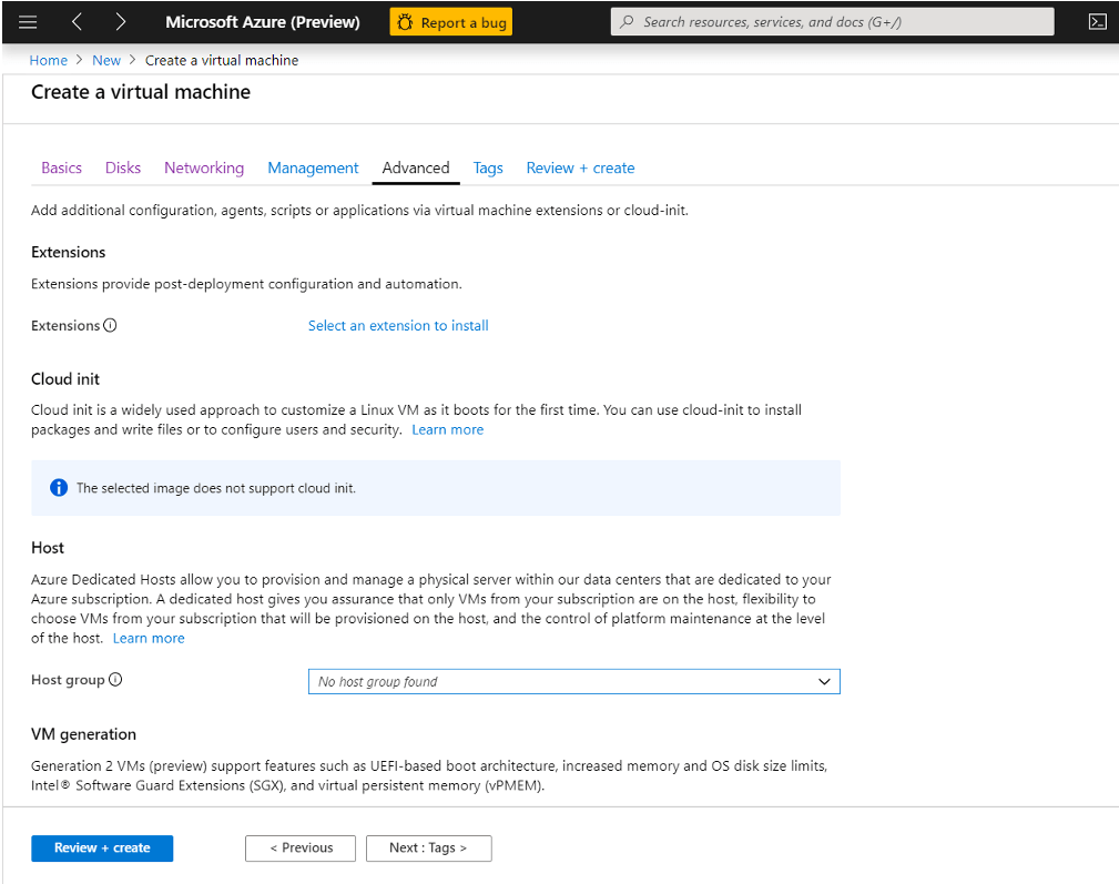 Next: Review + create > ile devam ediyorum.