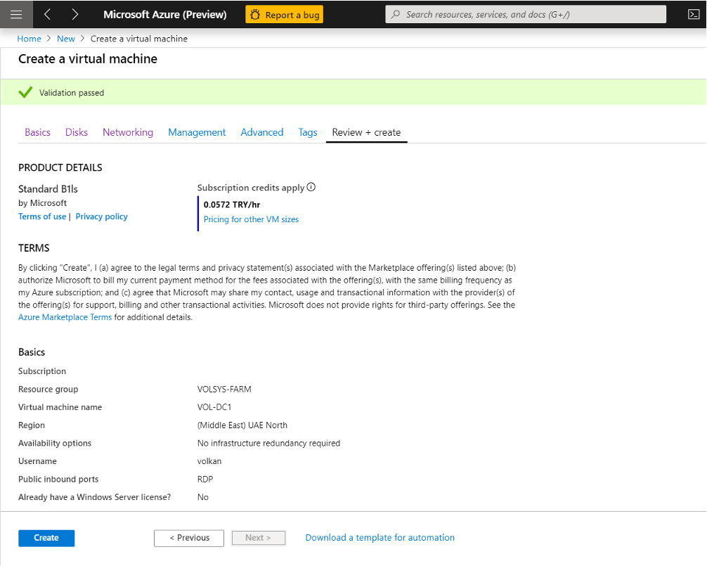 Region belirtiyoruz, hangi azure site’ımızı seceçeğemize karar veriyoruz. Benim tercihim (Middle East) UAE North.