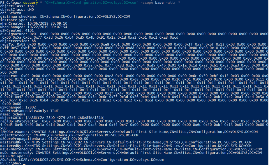 dsquery * “CN=Schema,CN=Configuration,DC=volsys,DC=com” -scope base -attr *