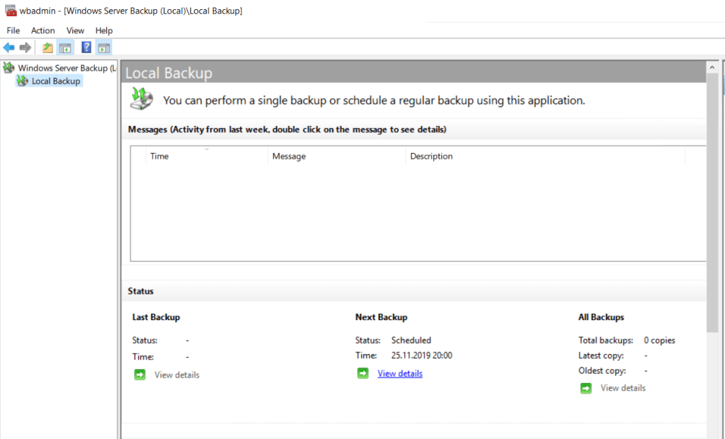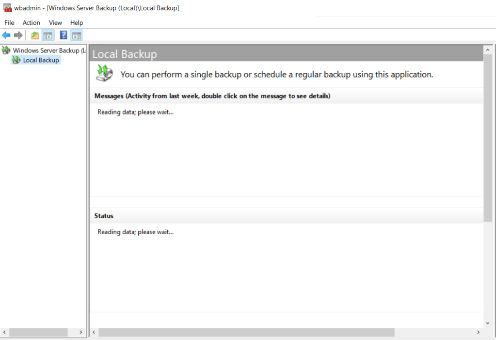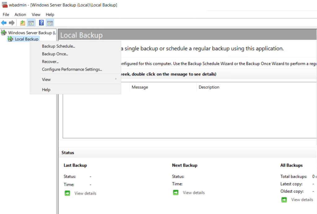 Windows Server Backup açılır.