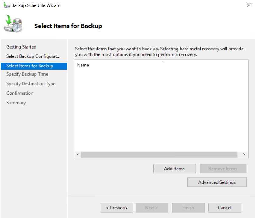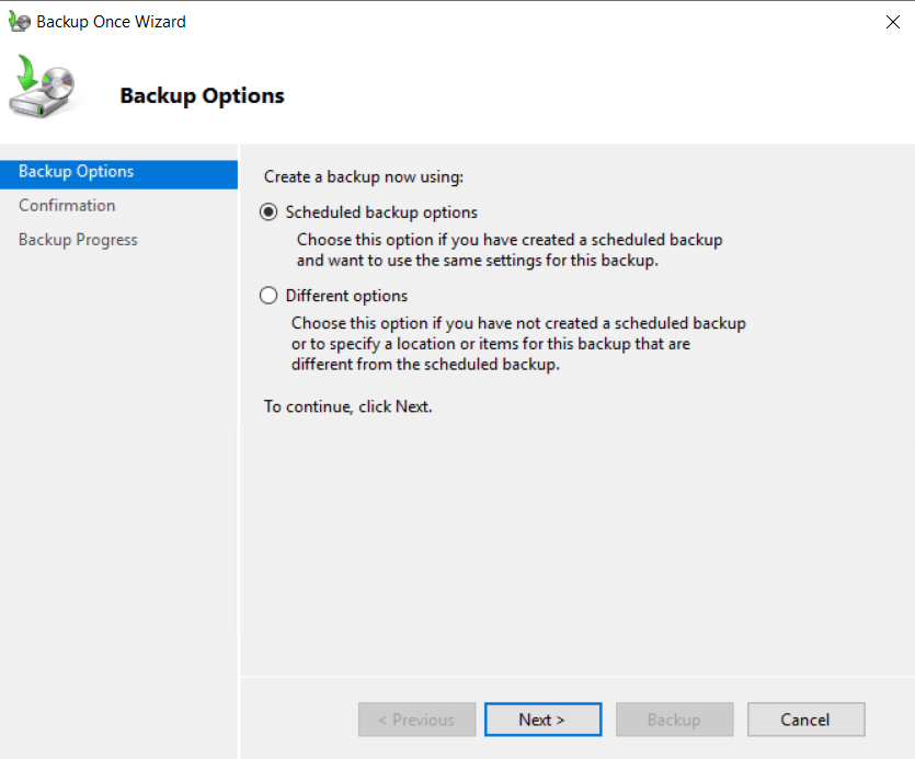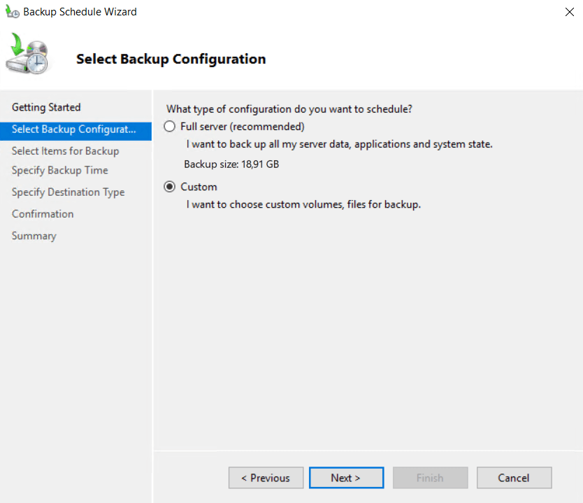 Select Backup Configuration’den Custom seçilir ve Next ile devam edilir.