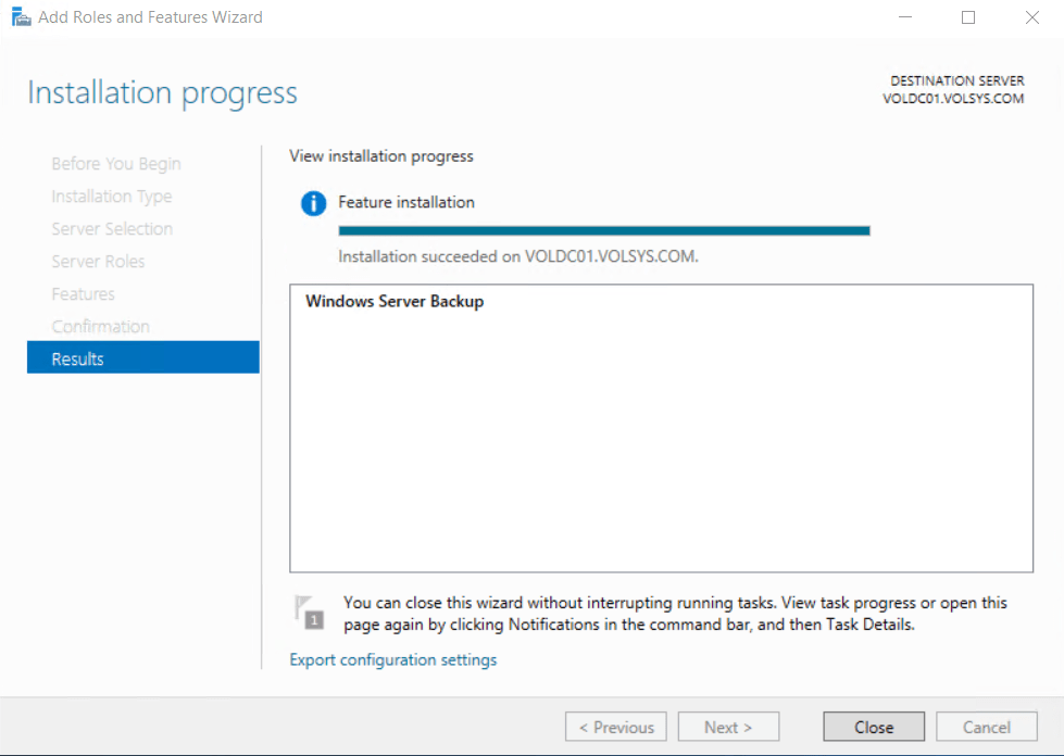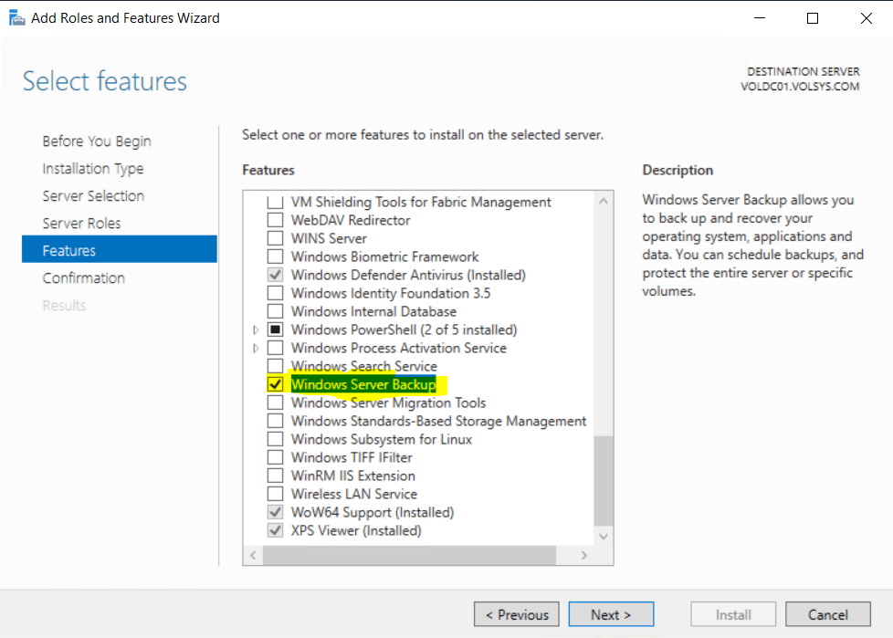 Windows Server 2019 Active Directory için önerilen backup alma yöntemi BMR‘dır. Ayrıca bir domain’de en az 2 DC’den mümkünse 2 ayrı backup yazılımı ile backup alınması önerilmektedir. Microsoft’un ücretsiz featureı olan Windows Server Backup Domain Controller’a yükleyerek Active Directory backup’I schedule edeceğiz.