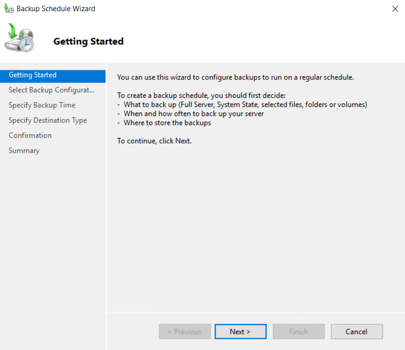 Backup Schedule Wizard açılır ve Next ile devam edilir.