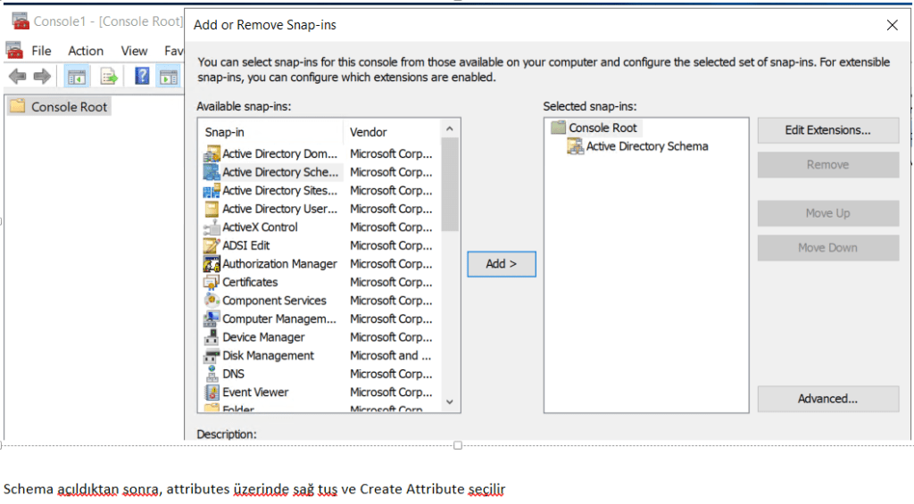 Active Directory’ye yeni bir attribute eklemek için önce schema’ya erişilir. Bunun için;