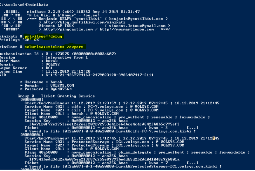 Temel olarak, DC’ye bağlı bir cihaz, kendisi için bir TGT bileti talep ederek DC’de kimliğini doğrular. TGT bileti belirli bir süre geçerlidir ve daha fazla bilet istemek için kullanılır. Elde ettiğimiz ticket’ları Mimikatz araçlarını kullanarak Pass to Ticket işlemini gerçekleştirmek için kullanabilmekteyiz.