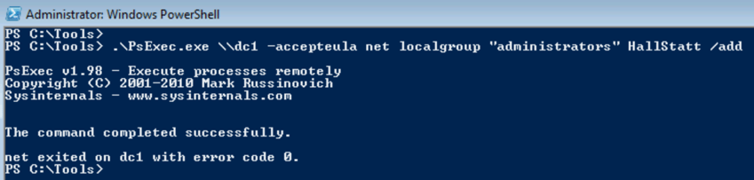 .\psexec.exe \\dc1 –accepteula net localgroup “administrators” Hallstatt /add