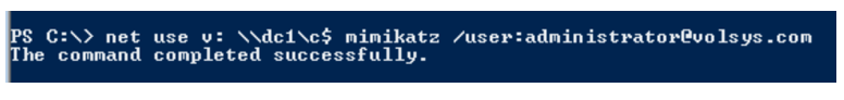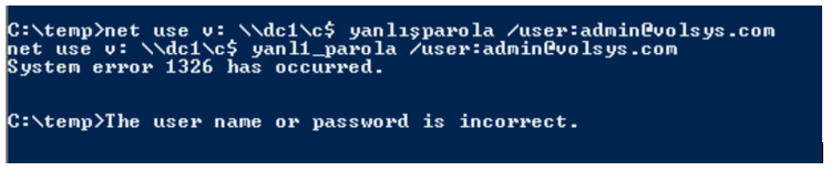 net use v: \\dc1\c$ yanlışparola /user:Admin@volsys.com