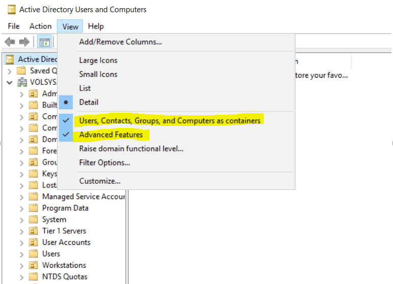 Active Directory Users and Computers View menüsünden, Advanced Features ve Users, contacts, Groups, and Computers as containers seçilir.