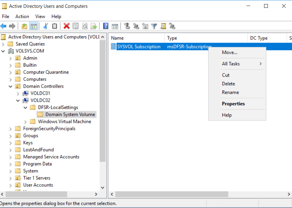 Restore’unu yaptığımız DC’nin Sysvol Subscrion’ı seçilir ve sağ tuş ile properties menüsü açılır.