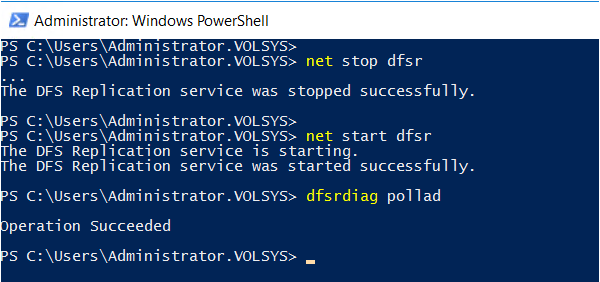 DFSR servisi restart edilir ve DFSRDIAG Pollad komutu çalıştırılır.