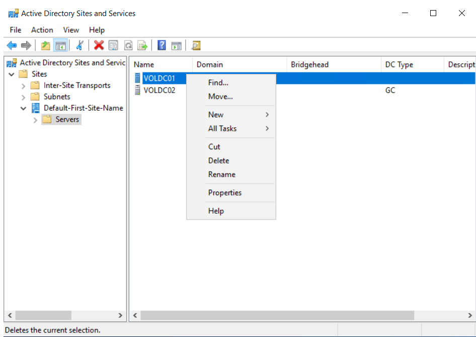 Active Directory Site and Services’dan aktif olmayan DC’ler kaldırılır.
