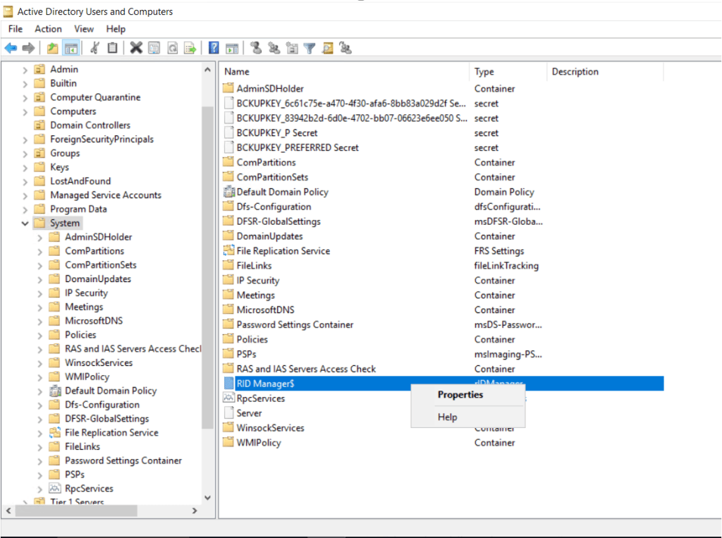 Active Directory Users and Computers – System – RID Manager$ – Properties seçilir.