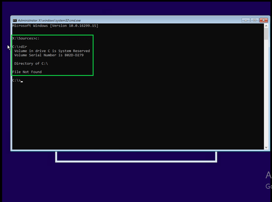 C: diyerek C sürücüsüne ulaşıyorum ve dir komutu ile içindeki dosyaları sorguluyorum. Gelen ekranda işletim sisteminin bu ekranda olmadığını görüyorum. İşletim sistemi normalde C’de olabilir ama bu ekranda açtığımız zaman, C’yi başka bir sürücüye atamış olabilir, mesela boot bölümleri var 100 mb’lık 300mb’lık bölümlere atamış olacaktır. Dolayısıyla ben ilk olarak burada işletim sistemimim nerede olduğunu bulacağım.