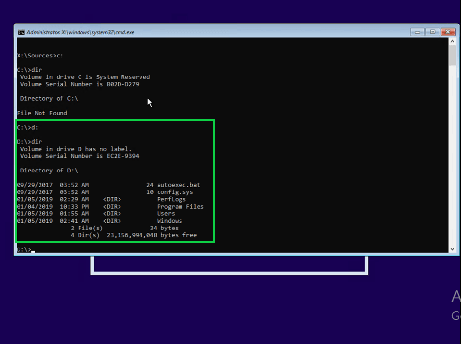 Şimdide d: diyerek ve ardından dir komutu çalıştırarak işletim sisteminin bu sürücü üzerinden olup, olmadığını kontrol ediyorum. Burada ise işletim sistemimin kurulu olduğunu Program files, users ve Windows klasörlerinden anlayabiliyorum.