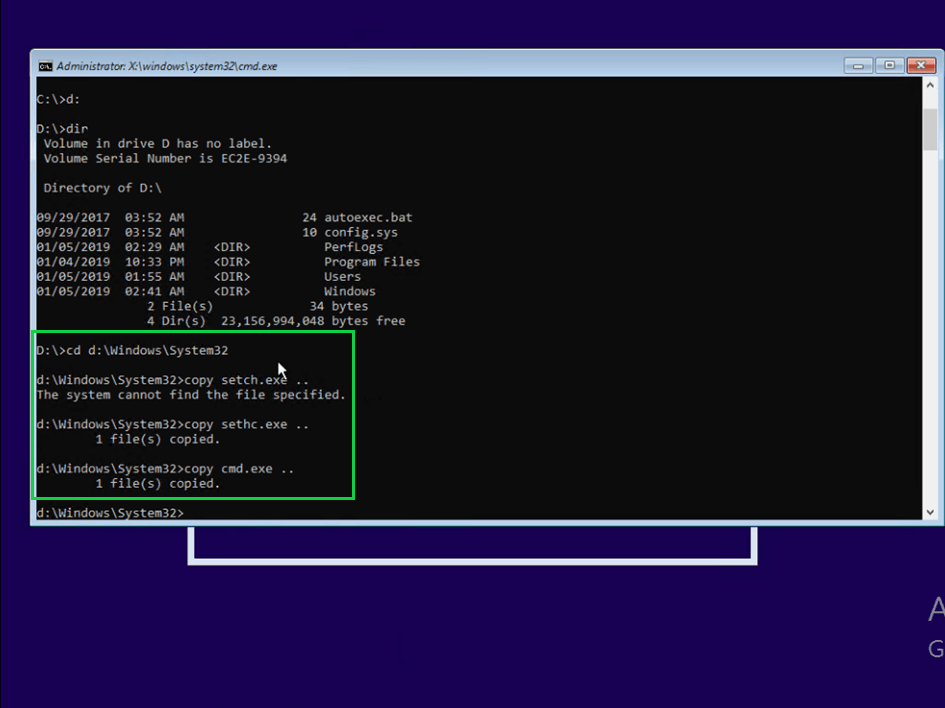 Sonrasında cd d:\Windows\System32 dizininin içerisine giriyorum. Burada copy “setch.exe ..” (yapışkan tuşları açan exe’dir.) setch.exe system32 altında var olan bir uygulamadır. Komutun sonunda yer alan “..” komutlarıyla ben bu setch.exe‘yi bir önceki klasöre yani Windows klasörüne bir kopyasını almış oluyorum.