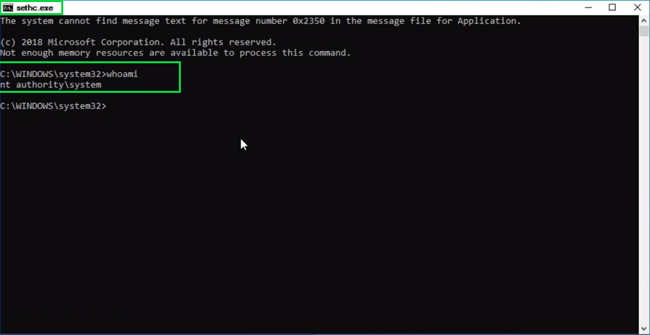 Bu işlemlerden sonra exit ile çıkıyorum ve ekranlarımı kapatıyorum, sonrasında bilgisayarımın restart olacaktır. Bilgisayarım açılırken bu sefer herhangi bir tuşa basmıyorum ve bilgisayarımın normal bir şekilde başlamasını istiyorum. Bilgisayarımın giriş ekranı geldikten sonra bu aşamada, shift tuşuna 5 kez basıyorum, ve komut satırının açıldığını görüyorum. Komut satırındayken whoami komutunu çalıştırdığımda, nt authority\system yetkili hesabı ile açıldığını görüyorum.
