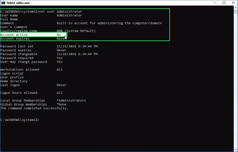 Komut satırı üzerinden net user komutu Administrator ile bu bilgisayar içerisindeki Administrator kullanıcısının detaylarını görebilirim. Account active kısmında hesabın aktif olup olmadığını anlıyorum.