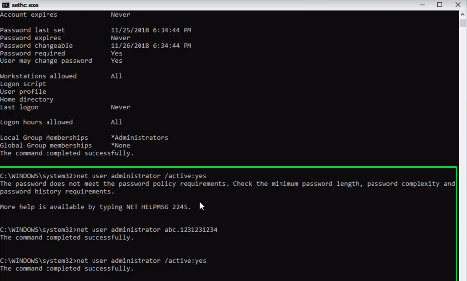 Net user administrator /active:yes komutunu kullanarak hesabı enable etmeyi deniyorum. Aşağıdaki hata ile karşılaştım, çünkü domainde bir bilgisayar olduğu için, GPO üzerinden uygulanan password politikasını bilgisayar almış durumdadır. Bu sebepten dolayı ilk olarak administrator hesabına net user administrator abc.1231231234 komutunu girerek, bu şifreyi tanımlıyorum. Ardından Net user administrator /active:yes komutunu tekrar yazarak administrator hesabını aktif hale getiriyorum.
