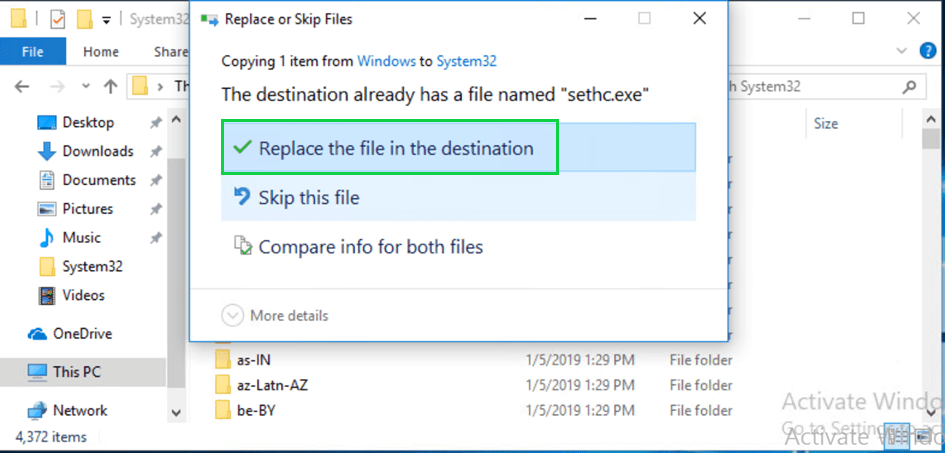 Başarılı bir şekilde taşıdık, şimdi bilgisayar üzerinden cmd yazarak, komut satırını çalıştırmak istediğimizde sorunsuz çalışacaktır. Şimdi ise sethc.exe’yi alarak, system32 altına taşımamız gerekmektedir, önceki işlemde eski dosyanın adını da setch.exe olarak değiştirdiğimiz için, sistem aynı isimli dosyadan olduğunu söyleyecek ve eski dosyayı değiştirip, değiştirmeyeceğimizi bize soracaktır. Replace diyerek, değiştirmesini sağlıyoruz ve her şeyi eski haline döndürdük.