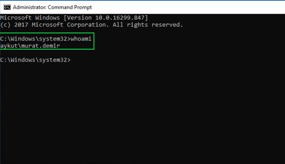 Şimdi bilgisayar üzerinden başlata gelip, komut satırını administrator olarak çalıştır dediğimde çalıştığını görebiliriz. Şuanda makinede administrator haklarına sahip olduğumuz local admin gerektiren tüm işlemleri gerçekleştirebiliriz.