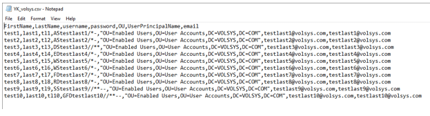 Active Directory’de daha önceden belirlenmiş özellikler de kullanıcı oluşturmak için önce CSV dosyası hazırlıyoruz. İstenen özellikler için attribute’lerini giriyoruz. Dosyamız hazır olduktan sonra bu bilgileri Active Directory’ye import edecek olan Script’I düzenliyoruz.