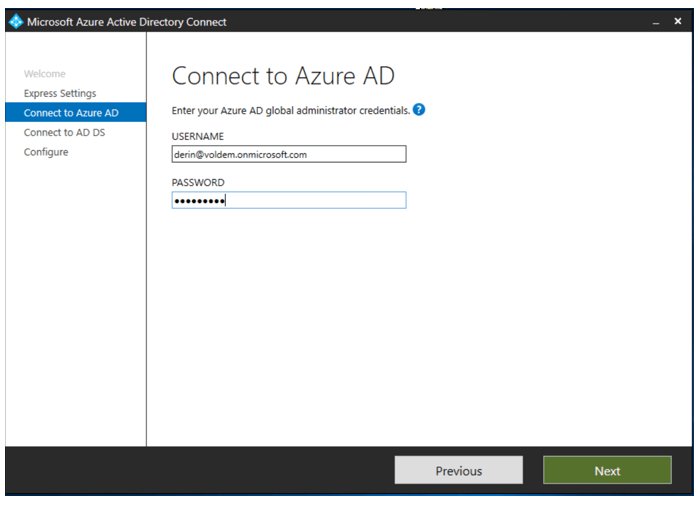 Azure AD’ye bağlanabileceğim kullanıcı ve parolamı giriyorum. Next ile devam ediyorum. Bu kullanıcı GLOBAL Administrator olmalıdır.