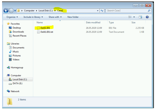Data Diski oluşturulur. İçerisinde Case1 Folder ve içerisinde gerekli dosyalar bulunur. FTK Imajer ile delil’in imajı E01 formatında alınır.