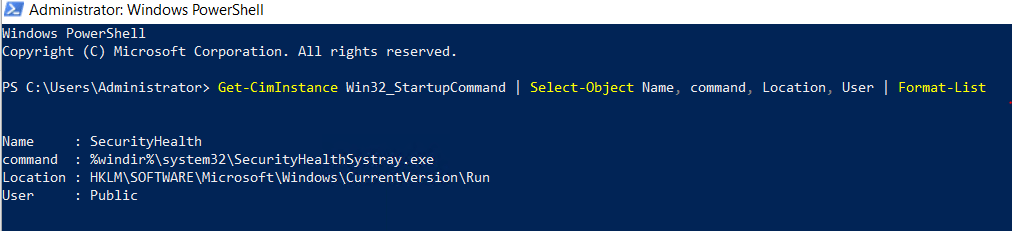 Get-CimInstance Win32_StartupCommand | Select-Object Name, command, Location, User | Format-List