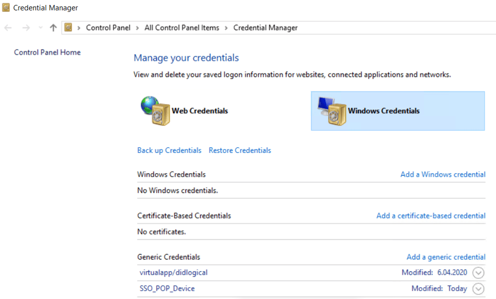 Yada Credential Manager’dan Web Credential ve Windows Credential kontrol edilir.