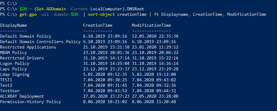 get-gpo -all -domain $DN | sort-object creationTime | ft Displayname, CreationTime, ModificationTime