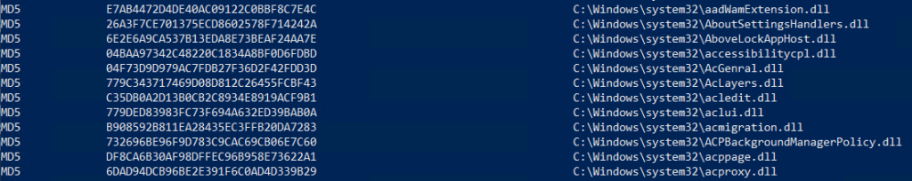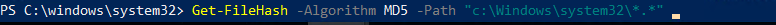 Get-FileHash -Algorithm MD5 -Path “C:\Windows\System32\*.*” | FL