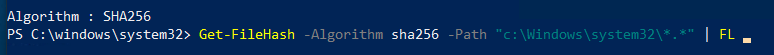 Get-FileHash -Algorithm SHA256 -Path “C:\Windows\System32\*.*” | FL