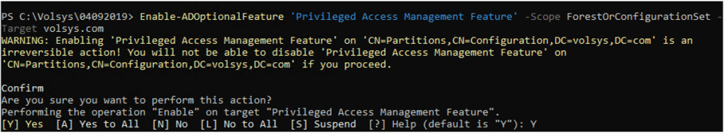 Enable-ADOptionalFeature ‘Privileged Access Management Feature’ -Scope ForestOrConfigurationSet -Target volsys.com