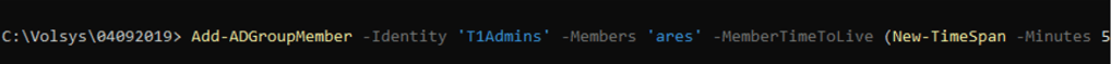 Add-ADGroupMember -Identity ‘T1Admins’ -Members ‘ARES’ -MemberTimeToLive (New-TimeSpan -Minutes 15)
