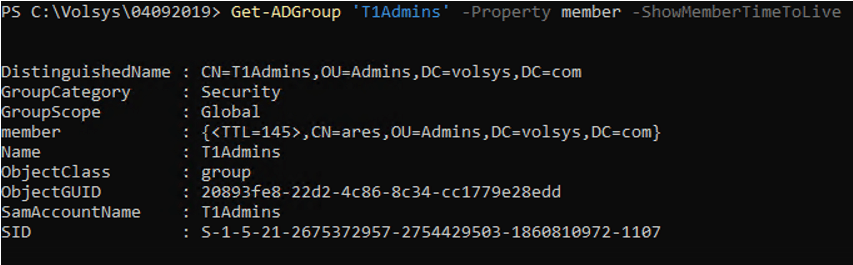 Get-ADGroup ‘T1Admins’ -Property member -ShowMemberTimeToLive
