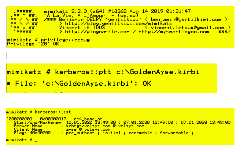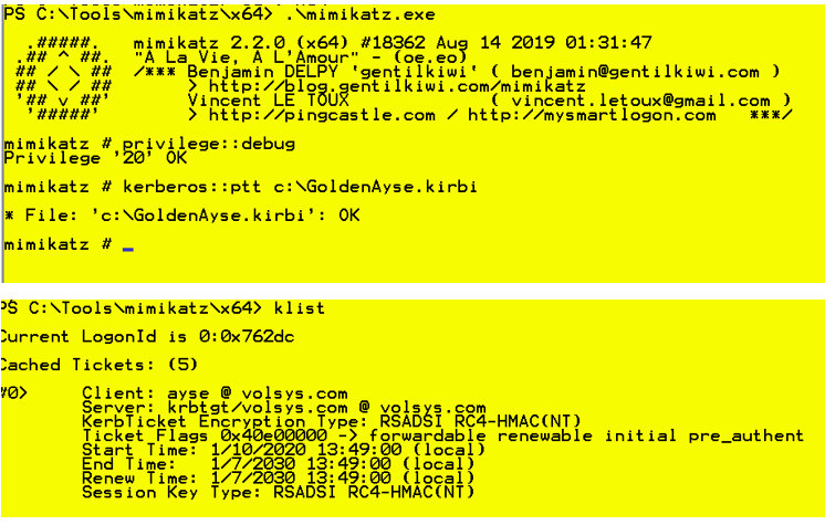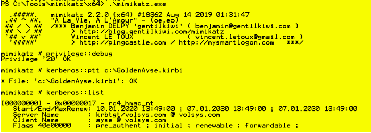 İlk olarak elde etiğimiz Golden Ticket’ımızı Mimikatz toolu kullanılarak aktif hale getiriyoruz.