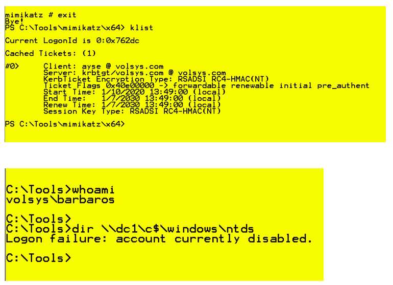 Aşağıda da görüleceği üzere Golden Ticket’ı olan bir kullanıcı Domain Admin grubundan çıkarıldıktan sonra Disable edilirse, Ticket aktif olsa dahi herhangi bir aktivite yapılamamaktadır. Logon Failure: account currently disabled. uyarısı alınmaktadır.