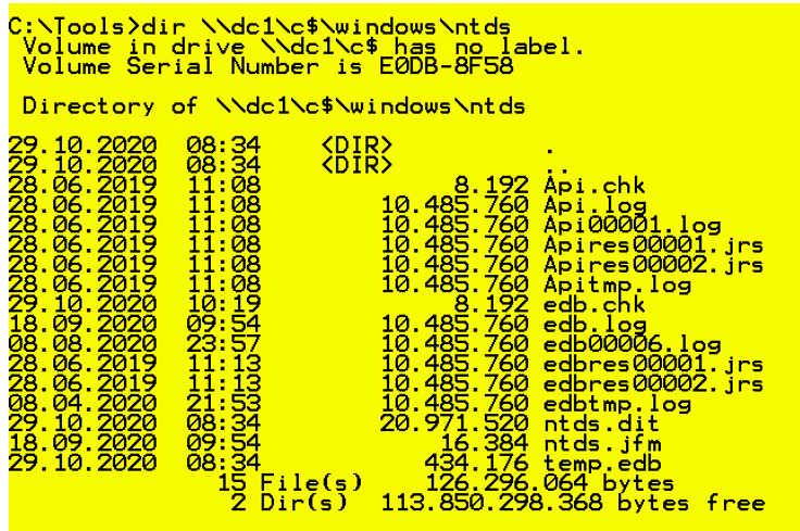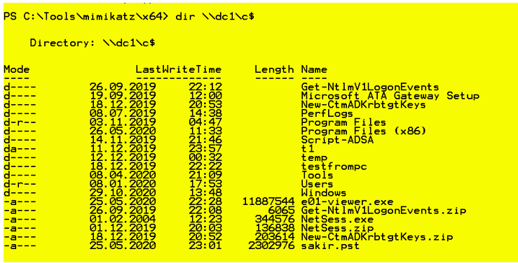Domain admin hakları devam ediyor. DC’nin c diskinin içeriğini listeleyebiliyoruz.