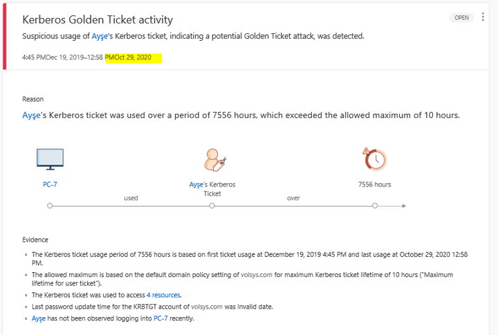 KRBTGT, 1 restart’tan sonra kerberos policy’de belirtilen maximum life time süresi kadar beklendikten sonra ( default’da 10 saattir), 2. restart yapıldı ve compromised olan Ayse account’u 2 defa resetlendikten sonra Golden Ticket expire edildi. Ayrıca başka account’larında compromise olması ihtimali için tüm accountların resetlenmesi kesinlikle önerilmektedir. Domainimiz de Compromize olan ve Golden Ticket’ı ele geçirilen accountları ATA Advanced Threat Analytics ile tespit edebiliyoruz.