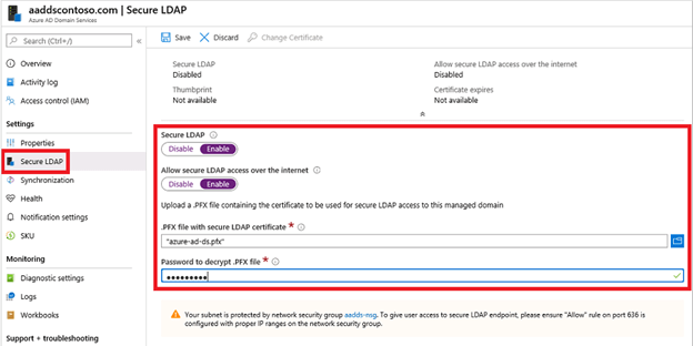 Azure AD DS penceresinin sol tarafından Secure LDAP seçilir.