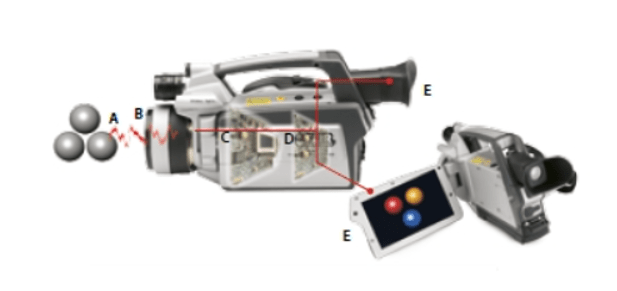 Bir nesne üzerinden gelen kızılötesi enerji(A), mercek(B) tarafından kamera içindeki kızılötesi detektör(C) üzerine düşürülür. Bu detektör resmin işlenmesi için bilgileri elektronik sensörlere(D) gönderir. Bu işlemlerin sonucunda bilgiler bizim görebileceğimiz bir resme dönüştürülerek kameradaki ekranlarda(E) gösterilir.