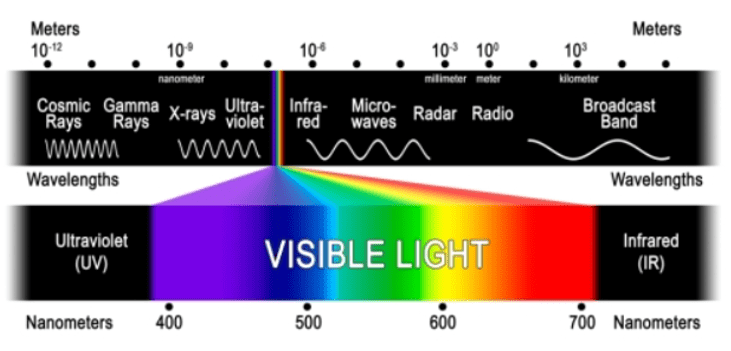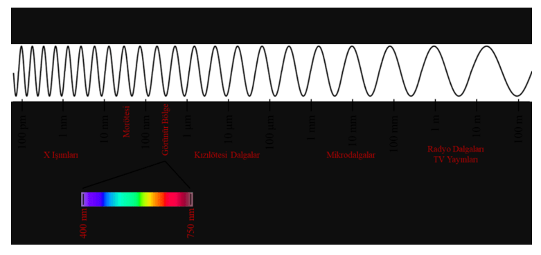 Foton, dalga perspektifinden bakıldığında ışık bir elektromanyetik dalgadır ve saniyede yaklaşık 300.000 km hızda hareket eder. Elektromanyetik dalgalar dalga boylarına göre sınıflandırılır ve Şekil 2’de yer alan elektromanyetik spektrumu (ışık tayfı) oluştururlar. Gözümüzün görebildiği dalga boyu aralığının (400nm-750 nm) elektromanyetik spektrumun çok küçük bir kısmı olduğunu fark etmiş olabilirsiniz . Dalga boyları görünür ışıktan daha uzun olan, 750 nanometreden mikrodalgalara kadar olan kesim ise kızılötesi bölge olarak adlandırılır.