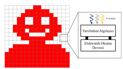 Aşağıda gösterilen basitleştirilmiş kamera görüntüsü benzetimi 64 pikselden oluşuyor. Her bir piksel, foton (ışık taneciği) algılayıcı ve algılanan foton şiddetini elektriksel sinyale dönüştüren elektronik okuma devresinden oluşuyor. Elektriksel sinyalin şiddeti ise ilgili pikselin ölçülen parlaklığını belirliyor.