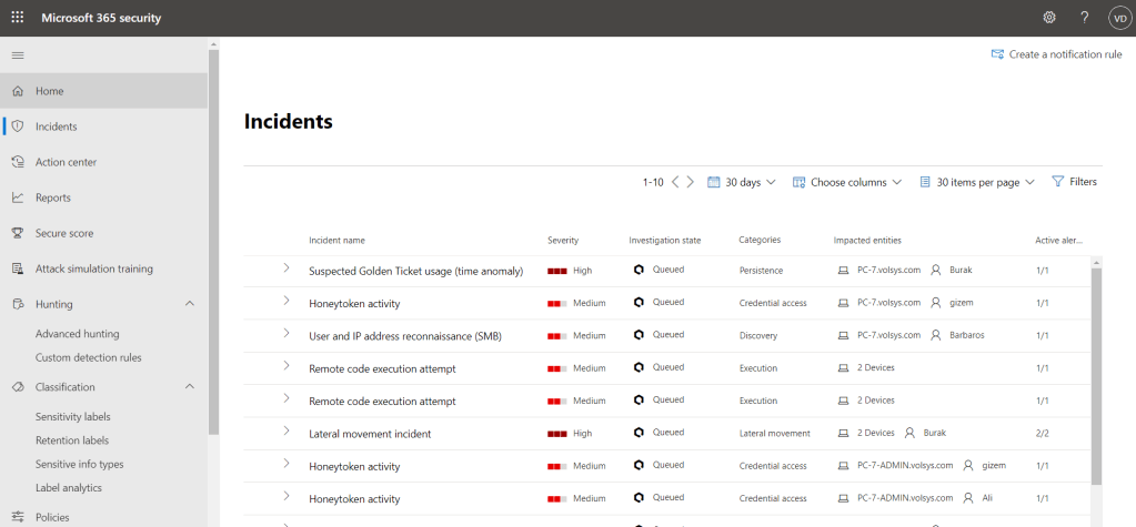 Microsoft Defender for Identity, kuruluşunuza yönelik gelişmiş tehditleri, güvenliği aşılmış kimlikleri ve kötü niyetli local eylemleri belirlemek, tespit etmek ve araştırmak için Active Directory sinyallerini kullanır. Bu çözümün eski ismi Azure ATP ve On-Prem karşılığı Advanced Threat Analytics’tir (ATA).